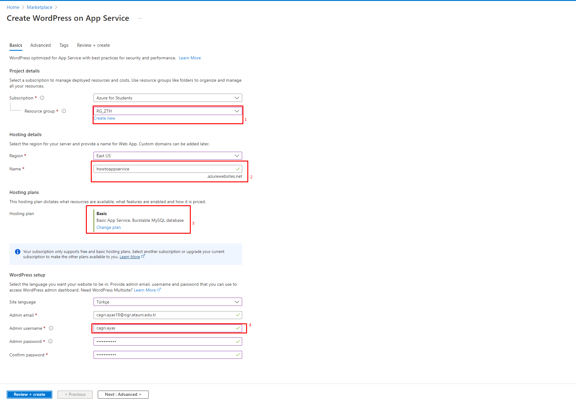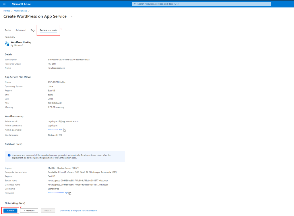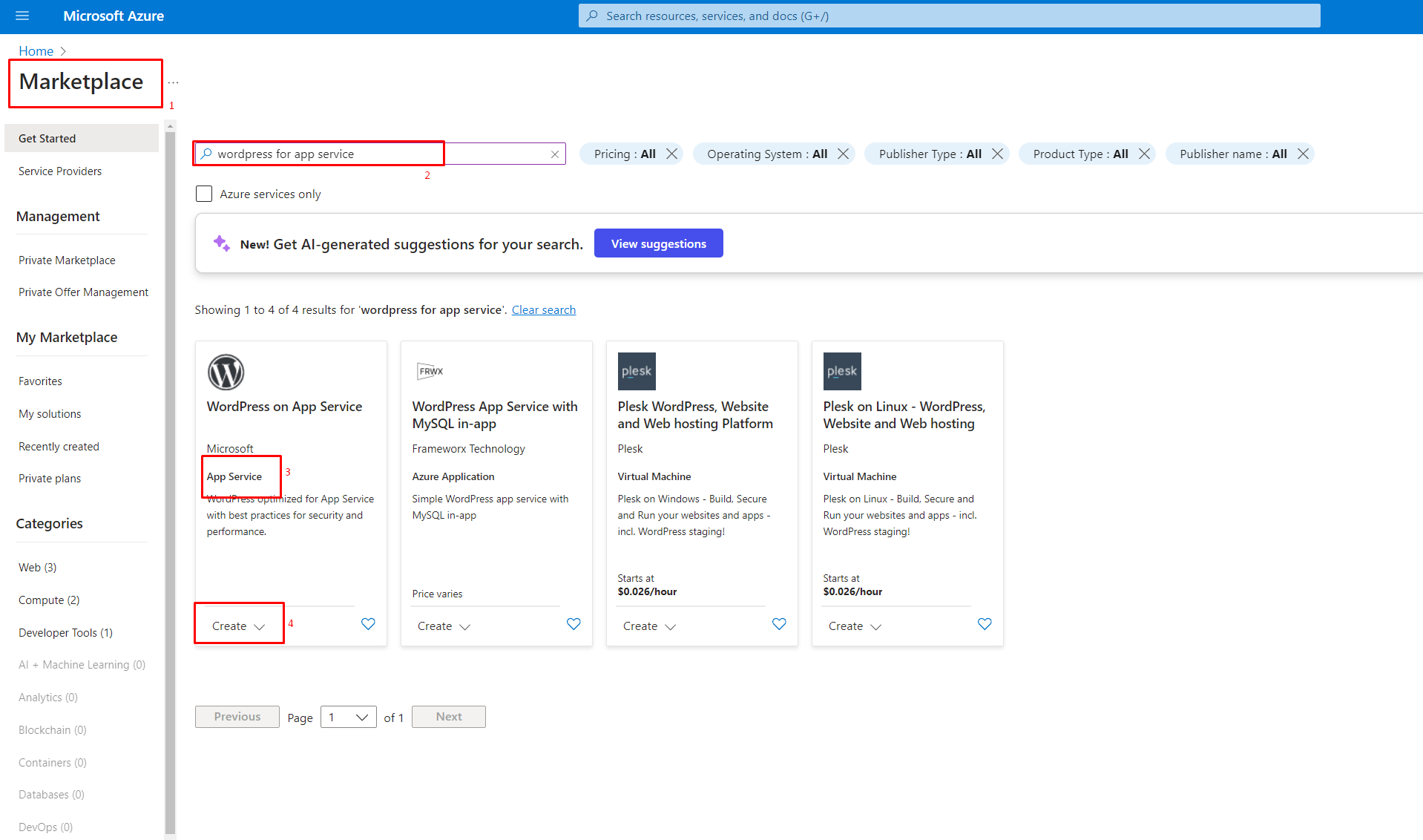 En kolay ve hızlı olarak “Marketplace” üzerinden “WordPress’in “App Service” için olan versiyonunu bulup “Create Seçeneğine Tıklayalım.