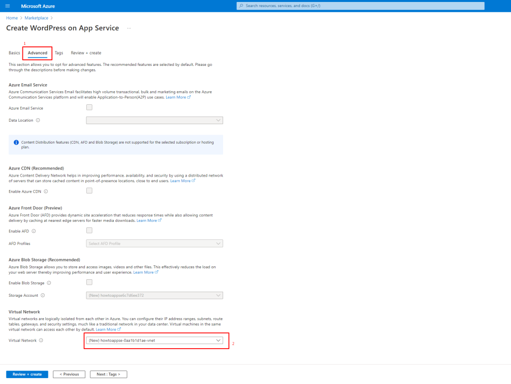 Advanced sekmesinde ise ilgili konfigürasyonlara göz atıyoruz. Virtual Network’ümüz varsa seçiyoruz. Zaten bizim için bir tane otomatik oluşuyor.