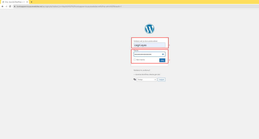 Yönetim sayfasına erişebilmek için linkimizin sonuna /wp-admin uzantısını yazmamız gerekiyor.